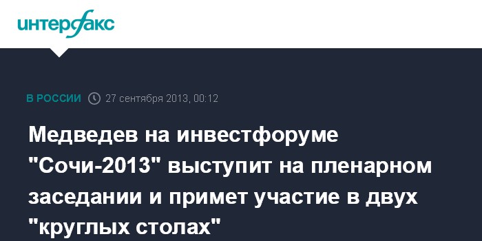 Медведев на инвестфоруме "Сочи-2013" выступит на пленарном заседании и примет участие в двух "круглых столах"