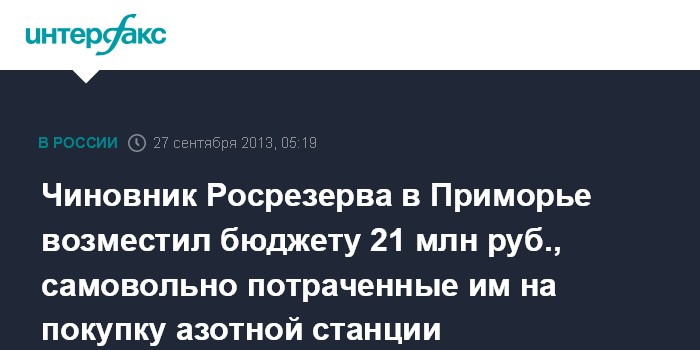 Чиновник Росрезерва в Приморье возместил бюджету 21 млн руб., самовольно потраченные им на покупку азотной станции
