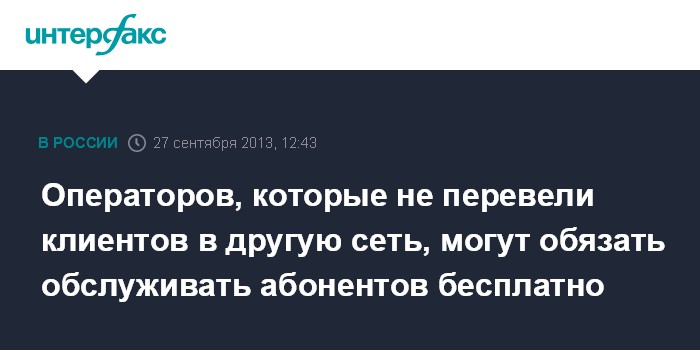 Сочи. 27 сентября. INTERFAX.RU - Минкомсвязи РФ предлагает сотовым операторам, не сумевшим в срок исполнить заявку абонента по переходу в другую сеть с сохранением номера (услуга MNP), оказывать услуги связи этому пользователю бесплатно до осуществления переноса.