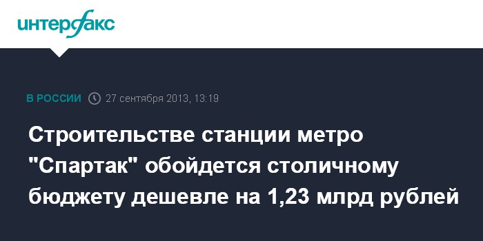 Строительстве станции метро "Спартак" обойдется столичному бюджету дешевле на 1,23 млрд рублей