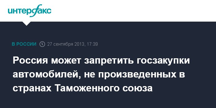 Москва. 27 сентября. INTERFAX.RU - Начиная со следующего года в РФ планируется ввести запрет на поставку для государственных и муниципальных нужд легковых и грузовых машин и автобусов, произведенных в странах, не входящих в Таможенный союз (Россия, Белоруссия и Казахстан).