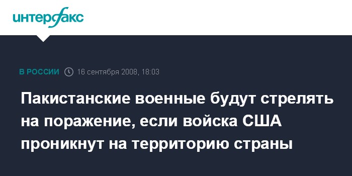 Вашингтон. 16 сентября. INTERFAX.RU - Пакистанским военным отдан приказ открывать огонь на поражение в случае, если войска США предпримут наземные или воздушные рейды в районы страны, граничащие с Афганистаном, сообщает американский телеканал CNN.
