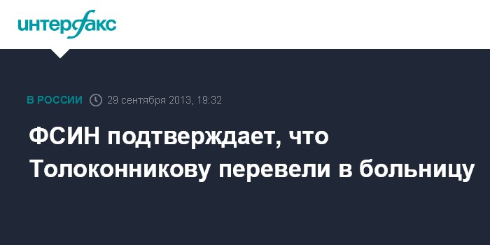 Москва. 29 сентября. INTERFAX.RU - В Федеральной службе исполнения наказаний подтвердили факт перевода осужденной участницы Pussy Riot Надежды Толоконниковой в ведомственный медстационар. "Сегодня по рекомендации врачей Н.Толоконникова согласилась на перевод в больницу номер 2 МСЧ-13 ФСИН России для дальнейшего динамического наблюдения за состоянием ее здоровья", - сказал сотрудник пресс-службы УФСИН по Мордовии.