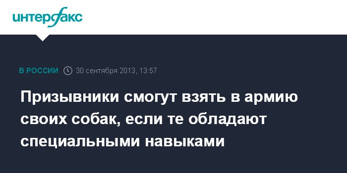 Москва. 30 сентября. INTERFAX.RU - Министерство обороны России допускает на военную службу призывников с их питомцами - собаками при наличии у них специальных навыков, сообщил в понедельник журналистам заместитель начальника Главного организационно-мобилизационного управления Генерального штаба Вооружённых сил России генерал-майор Евгений Бурдинский по случаю начинающегося 1 октября призыва граждан на военную службу.