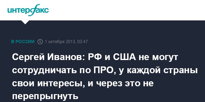 "По ПРО не можем сотрудничать, потому что у них свои интересы, у нас - свои. И какими бы у нас ни были личные отношения, через это не перепрыгнуть", - заявил С.Иванов в интервью ряду российских СМИ.