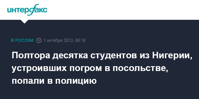 Москва. 1 октября. INTERFAX.RU - Полтора десятка нигерийских студентов попали в московскую полицию после того, как попытались устроить погром в посольстве своей страны в столице, сообщили "Интерфаксу" в пресс-службе ГУ МВД России по Москве.