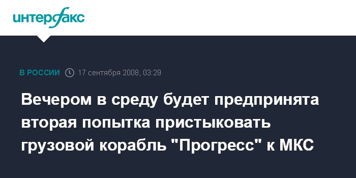 Вечером в среду будет предпринята вторая попытка пристыковать грузовой корабль "Прогресс" к МКС