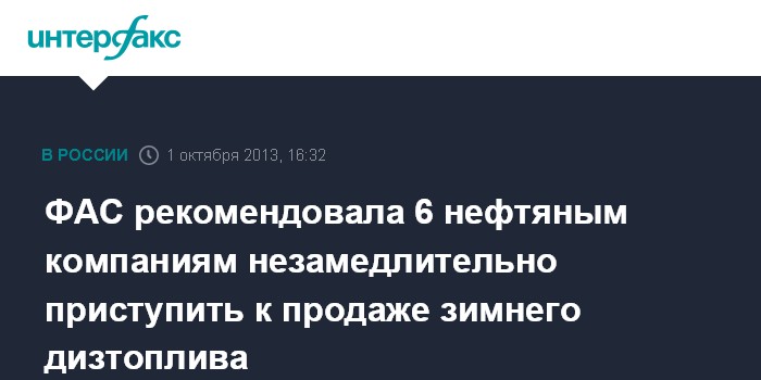 Москва. 1 октября. INTERFAX.RU - Федеральная антимонопольная служба рекомендовала "ЛУКойлу", "Сургутгнефтегазу", "Газпрому", "Газпром нефти", "Альянсу" и "Башнефти" незамедлительно приступить к реализации межсезонного и зимнего дизтоплива, говорится в сообщении ФАС.