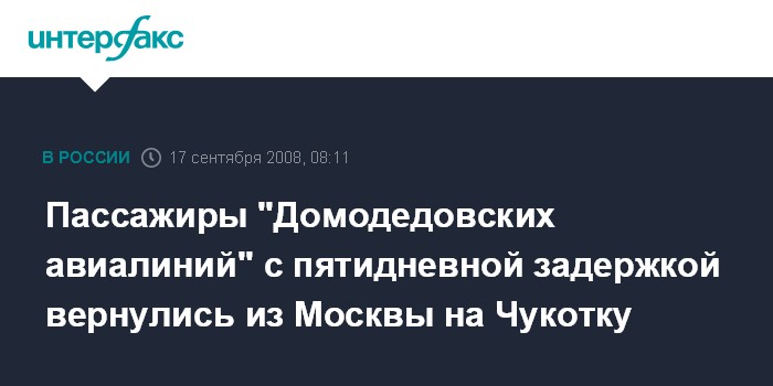 Анадырь. 17 сентября. INTERFAX.RU - Пассажиры рейса ОАО "Домодедовские авиалинии" (входит в состав альянса "Air Union") после задержек вылета из Москвы, продолжавшихся пять дней, прибыли в аэропорт Анадыря.