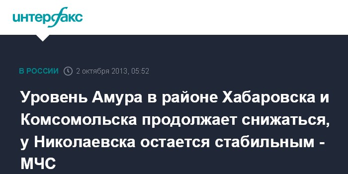 Хабаровск. 2 октября. ИНТЕРФАКС-ДАЛЬНИЙ ВОСТОК - Вода в реке Амур в черте Хабаровска по данным на 08:00 местного времени (01:00 мск) упала на 8 см, уровень реки составляет 437 см, сообщает пресс-служба ГУ МЧС по региону в среду.