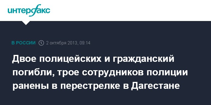 Махачкала. 2 октября. INTERFAX.RU - По данным следствия, в боестолкновении в Левашинском районе Дагестана погибли двое полицейских и один местный житель, трое сотрудников полиции получили ранения.
