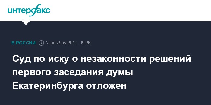 Екатеринбург. 2 октября. INTERFAX.RU - Заседание по иску оппозиционных депутатов о признании недействительными решений, принятых на первом заседании городской думы, перенесено на 3 октября.