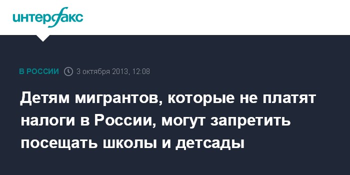 Москва. 3 октября. INTERFAX.RU - В Госдуму внесен законопроект, которым фактически вводится запрет на прием в детские сады и школы детей мигрантов, если их родители не платят налоги в Россию.