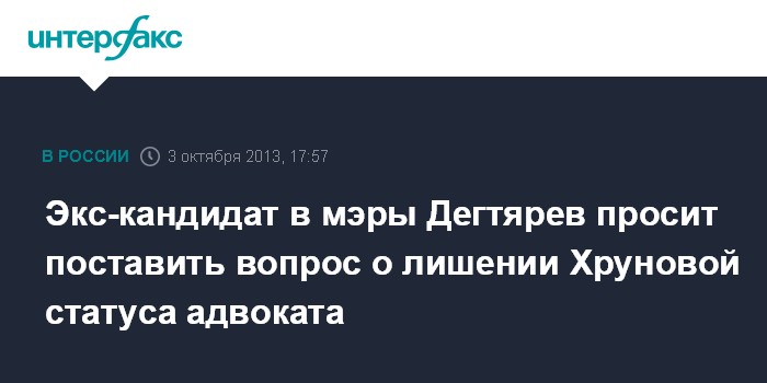 Москва. 3 октября. INTERFAX.RU - Депутат Госдумы, экс-кандидат в мэры Москвы от ЛДПР Михаил Дегтярев направил на имя генпрокурора РФ Юрия Чайки письмо с просьбой рассмотреть возможность лишения статуса адвоката Ирину Хрунову, которая защищает Надежду Толоконникову, осужденную по делу Pussy Riot.