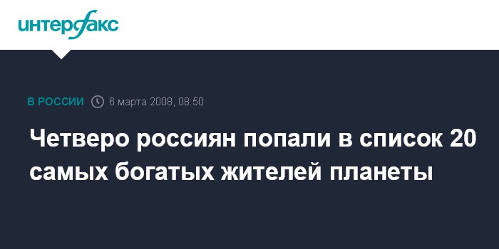 В список 20 самых богатых жителей планеты попало четверо россиян. Помимо девятого богача планеты О.Дерипаски и пятнадцатого Р.Абрамовича, в "двадцатку" входят Алексей Мордашов ($21,2 млрд) и Михаил Фридман ($20,8 млрд).