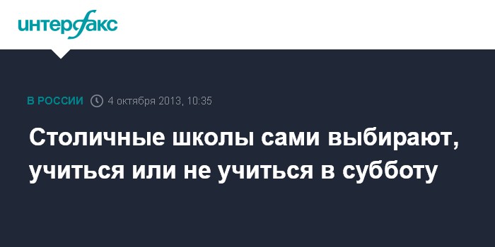 Москва. 4 октября. INTERFAX.RU - Департамент образования столицы сообщил об увеличении обращения граждан с просьбой отменить в школах города обучение в субботний день и организовать образовательный процесс для школьников на всех ступенях обучения в режиме пятидневной учебной недели.
