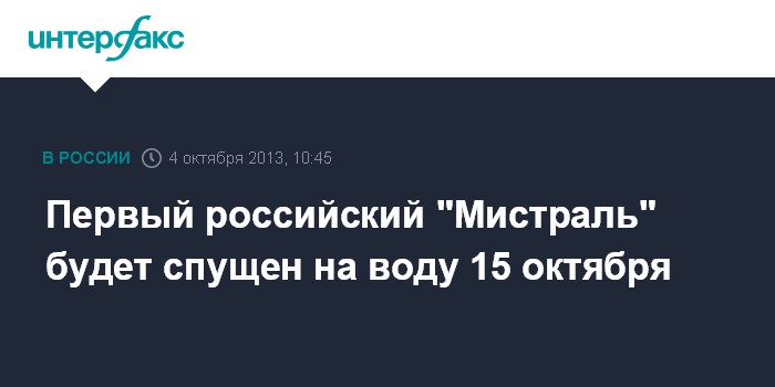 Москва. 4 октября. INTERFAX.RU - Первый десантный вертолетоносный корабль-док (ДВКД) "Владивосток" типа "Мистраль" после сборки в Сен-Назере (Франция) всего корпуса корабля будет спущен на воду 15 октября, сообщили в пятницу "Интерфаксу" в компании STX France.