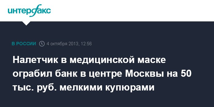Налетчик в медицинской маске ограбил банк в центре Москвы на 50 тыс. руб. мелкими купюрами