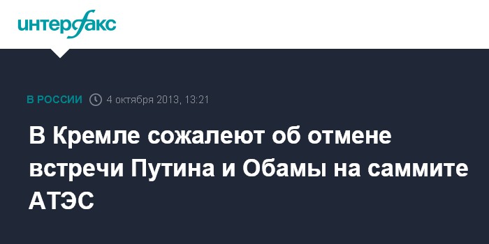 "Мы сожалеем, что встреча не состоится, потому что в целом, безусловно, в двусторонних отношениях существует большая потребность в продолжении диалога на высшем уровне: обилие вопросов двусторонней повестки дня, а также в первую очередь международные вопросы, во главе которых Сирия", - сказал Песков, отвечая на вопрос "Интерфакса", как в Кремле отреагировали на решение президента США отменить участие в саммите АТЭС и, соответственно, на отмену встречи Путина и Обамы, которая должна была пройти на Бали.