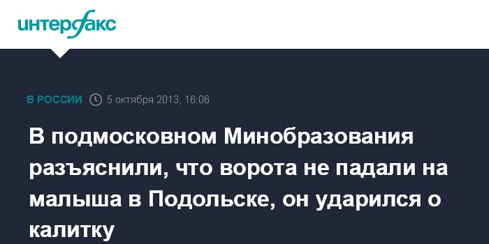 Красногорск. 5 октября. INTERFAX.RU - Школьные ворота не падали на 2,5 мальчика в подмосковном Лыткарино, он ударился головой о калитку, когда она самортизировала, сообщила министр образования региона Марианна Кокунова. "Это произошло вчера в подольской школе. Когда закончились уроки, мама вместе с двухлетнем ребенком пришла встречать старшего сына", - рассказала М.Кокунова в субботу "Интерфаксу".