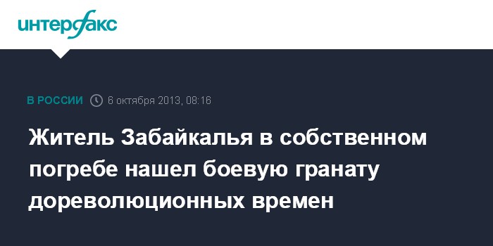 Новосибирск. 6 октября. ИНТЕРФАКС-СИБИРЬ - В селе Засопка Читинского района Забайкалья местный житель в своем подполье обнаружил боевую гранату времен гражданской войны, сообщает пресс-служба УМВД по региону в воскресенье.