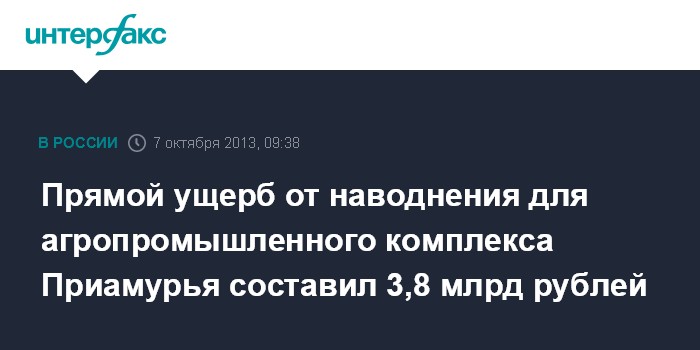 Хабаровск. 7 октября. INTERFAX.RU - Потери агрокомплекса Амурской области в результате наводнения составляют порядка 14 млрд рублей, сообщила пресс-служба правительства региона со ссылкой на уточненные данные регионального Минсельхоза.