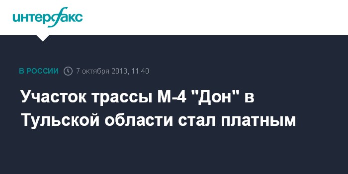 Тула. 7 октября. INTERFAX.RU - Проезд на участке федеральной автодороги М-4 "Дон" в обход города Ефремов Тульской области с 7 октября стал платным, сообщается на сайте госкомпании "Автодор".