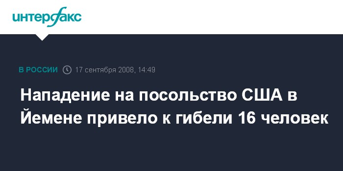Москва. 17 сентября. INTERFAX.RU - Как минимум 16 человек погибли во время взрыва заминированного автомобиля у здания посольства США в Йемене, сообщили агентству ЭФЭ в министерстве внутренних дел страны. В их числе шесть представителей сил безопасности, шесть террористов и четыре мирных жителя. Среди погибших нет сотрудников американского посольства, уверены в министерстве.