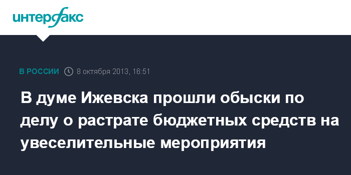 В СУ СКР по Удмуртии агентству "Интерфакс" сообщили, что выемка проводилась в рамках расследования уголовного дела, возбужденного по факту хищения неустановленными лицами бюджетных денежных средств муниципалитета "путем незаконной растраты на оплату корпоративных увеселительных мероприятий депутатов гордумы и сотрудников аппарата главы муниципального образования "город Ижевск" и гордумы".