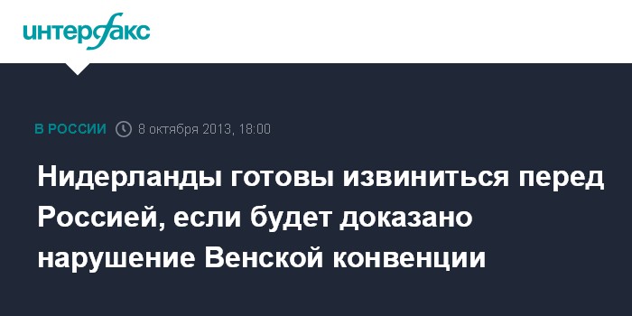 Москва/Гаага. 8 октября. INTERFAX.RU - Нидерланды готовы извиниться перед Россией за инцидент с задержанием дипломата, но только если расследование подтвердит факт нарушения Венской конвенции о дипломатических сношениях, заявил МИД Нидерландов.