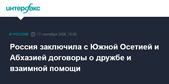 Москва. 17 сентября. INTERFAX.RU - Россия в среду подписала договоры о дружбе, сотрудничестве и взаимной помощи с Южной Осетией и Абхазией.
