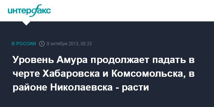 Хабаровск. 9 октября. ИНТЕРФАКС - ДАЛЬНИЙ ВОСТОК - Уровень воды в районе Николаевска-на-Амуре по данным на 08:00 местного времени (01:00 мск) поднялся на два см и составляет 239 см, сообщает пресс-служба ГУ МЧС по региону в среду.