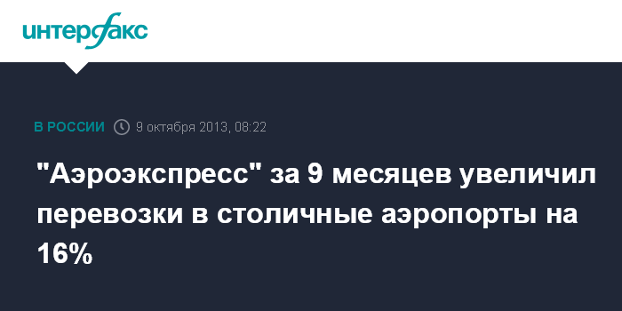 Москва. 9 октября. INTERFAX.RU - ООО "Аэроэкспресс" в январе-сентябре 2013 года увеличило перевозки пассажиров в столичные аэропорты на 16,2% по сравнению с тем же периодом 2012 г., до 12,6 млн человек, сообщила компания.