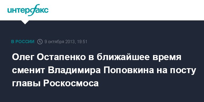 Москва. 9 октября. INTERFAX.RU - Отставка главы Роскосмоса Владимира Поповкина и назначение на эту должность Олега Остапенко, являющегося заместителем министра обороны, состоится в самое ближайшее время, сообщил "Интерфаксу" источник в ракетно-космической отрасли.