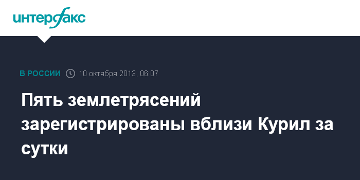 Южно-Сахалинск. 10 октября. ИНТЕРФАКС - ДАЛЬНИЙ ВОСТОК - Пять землетрясений произошли в среду возле Курил Сахалинской области, из них четыре - в акватории Тихого океана, одно - в Охотском море, сообщает пресс-служба Дальневосточного регионального центра (ДВРЦ) МЧС со ссылкой на Геофизическую службу РАН.