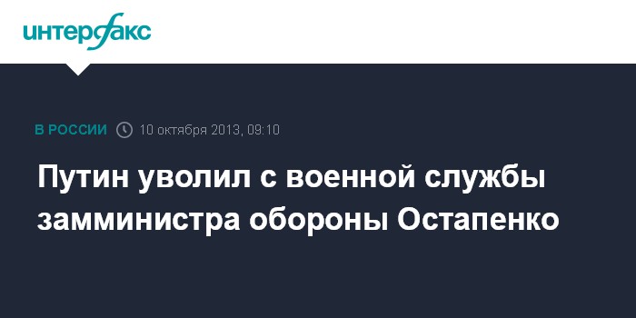 Москва. 10 октября. INTERFAX.RU - Президент России Владимир Путин своим указом освободил генерал-полковника Олега Остапенко от должности заместителя министра обороны Российской Федерации и уволил его с военной службы, сообщает в четверг пресс-служба Кремля.
