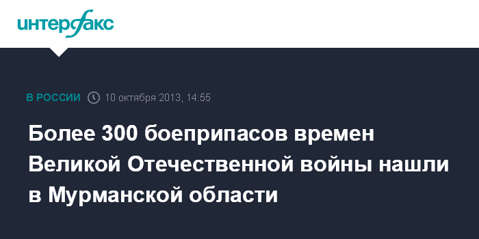 Мурманск. 10 октября. INTERFAX.RU - Полицейские Мурманской области обнаружили более 300 боеприпасов времен Великой Отечественной войны.