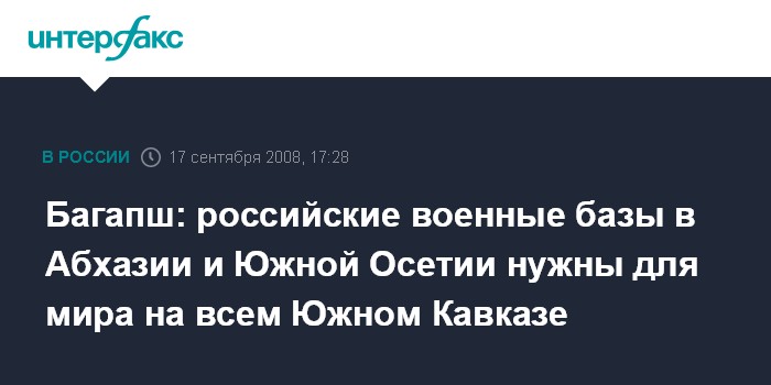 Москва. 17 сентября. INTERFAX.RU - Президент Абхазии Сергей Багапш заявил, что размещение российских военных баз в Абхазии и Южной Осетии будет способствовать миру на всем Южном Кавказе. "Мы все сделаем для того, чтобы на территории Абхазии и Южной Осетии были мощные базы российских Вооруженных сил. Не только для Абхазии и Южной Осетии, но и для мира на всем Южном Кавказе", - сказал президент Абхазии Сергей Багапш на пресс-конференции в Москве.