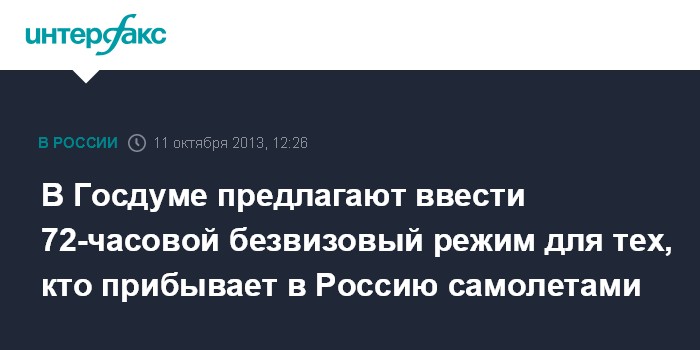 Санкт-Петербург. 11 октября. INTERFAX.RU - Возможность распространения практики безвизового 72-часового пребывания иностранных туристов в РФ на тех, кто прилетел в страну самолетами, рассматривается в Госдуме.