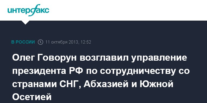 Москва. 11 октября. INTERFAX.RU - Владимир Путин своим указом назначил Олега Говоруна начальником управления президента РФ по социально-экономическому сотрудничеству с государствами - участниками СНГ, Республикой Абхазия и Республикой Южная Осетия, сообщила в пятницу кремлевская пресс-служба.