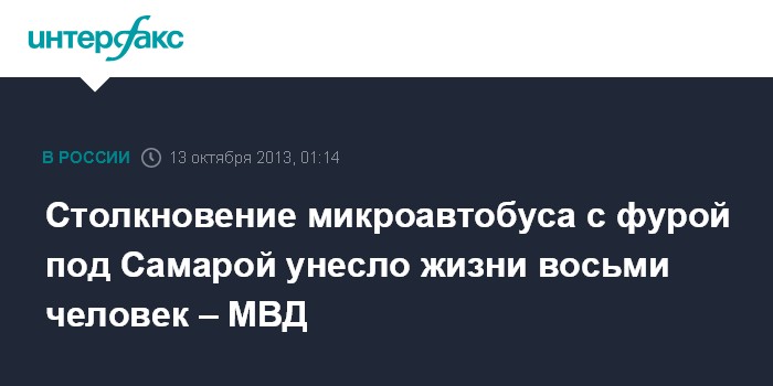 Самара. 13 октября. ИНТЕРФАКС-ПОВОЛЖЬЕ – Самарские полицейские выясняют обстоятельства аварии в Большечерниговском районе Самарской области, где в результате столкновения микроавтобуса и фуры погибли восемь человек, сообщил агентству «Интерфакс-Поволжье» начальник пресс-службы ГУ МВД по региону Сергей Гольдштейн.