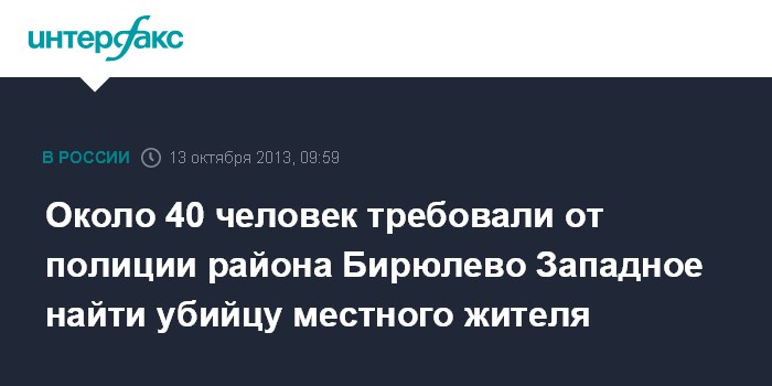 "12 октября в 22.00 у здания ОМВД России по району Бирюлево Западное собралась группа жителей района в количестве около 40 человек, которые требовали установить и задержать неизвестного кавказской внешности, который 10 октября неустановленным предметом причинил смертельные ранения жителю района и скрылся", - сказал сотрудник пресс-службы.