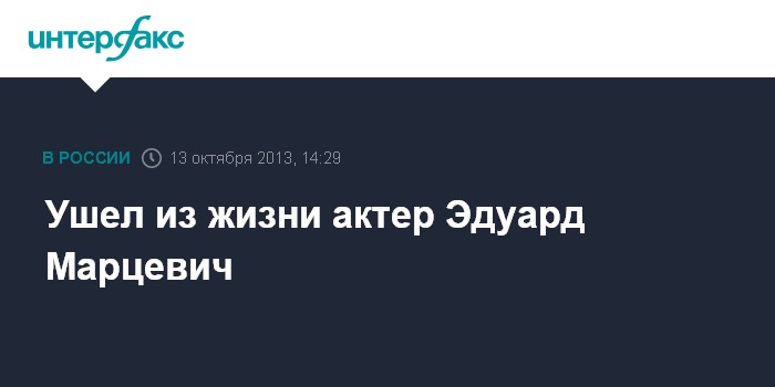 Москва. 13 октября. INTERFAX.RU - В Москве скончался известный актер Эдуард Марцевич, ему было 76 лет, сообщает в воскресенье радиостанция "Эхо Москвы" . Перед смертью артист долго болел и последние дни провел в больнице.
