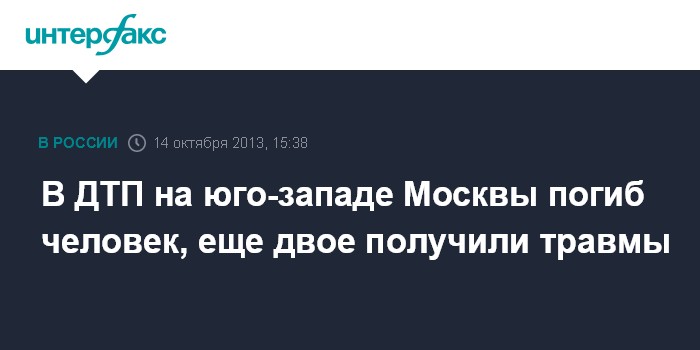 Москва. 14 октября. INTERFAX.RU - Один человек погиб и двое получили травмы в результате ДТП на юго-западе Москвы, сообщил "Интерфаксу" источник в правоохранительных органах.