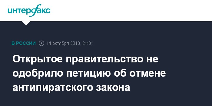 Москва. 14 октября. INTERFAX.RU - Члены экспертной рабочей группы федерального уровня Открытого правительства России не дали положительной оценки петиции об отмене антипиратского закона. Итоговое решение должно быть оформлено в течение четырех дней.