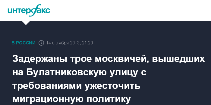 Москва. 14 октября. INTERFAX.RU - Полиция задержала несколько жителей столичного района Бирюлево Западное, пришедших вечером в понедельник к магазину "Бирюза" с требованиями к московским властям об ужесточении миграционной политики.