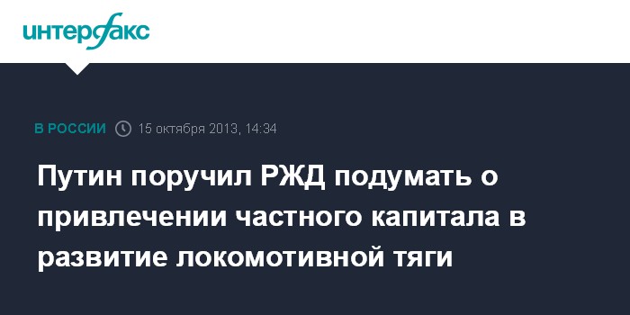 "Если это (ситуация с локомотивами - ИФ) смотрится ограничителем (развития железных дорог - ИФ), тогда нужно подумать, что делать в дальнейшем", - сказал президент на совещании в Тобольске, предложив РЖД "задуматься" о привлечении частного капитала.