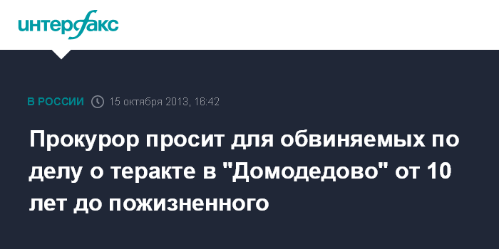 Красногорск. 15 октября. INTERFAX.RU - Гособвинение в Мособлсуде просит приговорить к срокам от 10 лет до пожизненного заключения обвиняемых в причастности к теракту в аэропорту "Домодедово", в результате которого в январе 2011 года погибли 37 человек.