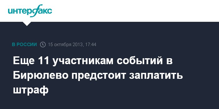 Москва. 15 октября. INTERFAX.RU - Еще 11 участников воскресных событий в столичном районе "Бирюлево" оштрафовал Чертановский суд Москвы. "11 человек оштрафованы на сумму от 500 рублей до 1000", - сообщила "Интерфаксу" пресс-секретарь суда Ольга Рожкова.
