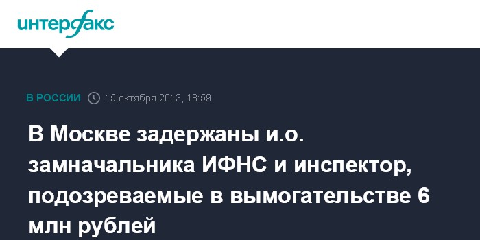 Москва. 15 октября. INTERFAX.RU - В Москве задержаны исполняющая обязанности заместителя начальника ИФНС N33 и налоговый инспектор, подозреваемые в вымогательстве взятки в размере 6 млн рублей, говорится в сообщении Федеральной налоговой службы.